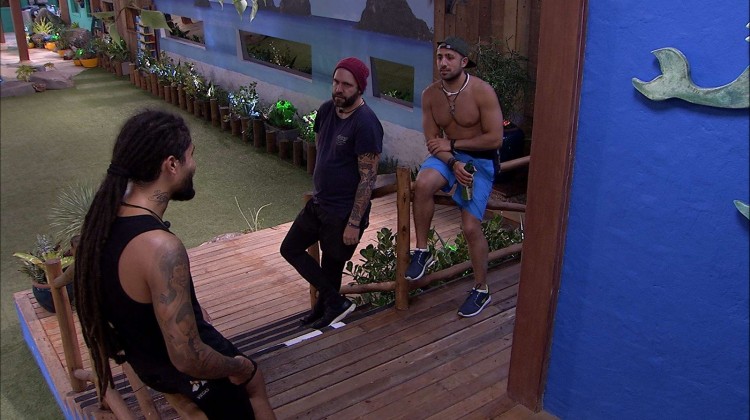 Na porta do Bangalô do Líder, Caruso e Viegas aguardam para entrar e ver as fotos de Breno e Wagner. Apoiado no corrimão, o músico comenta com o publicitário: "Vamos desencanar só de ir ao Paredão, quem decide é o público, mas só torce para eu não voltar porque se eu voltar, vou pegar".