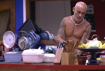 Na cozinha, Ayrton mexe em uma panela do Tá com Tudo. Kaysar repreende o brother: "Chefe, não pode...